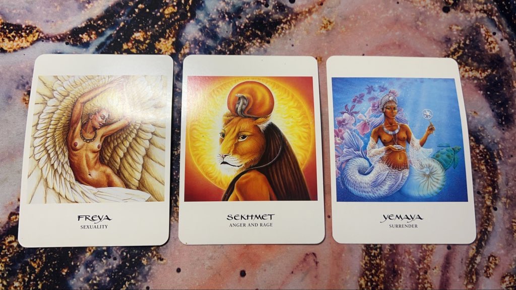 Yemaya: signals a time for surrender. Surrender doesnt mean giving up; rather you are giving over, asking for assistance so you can do what you want to do. The only way through some situations is to surrender and open to something greater.
