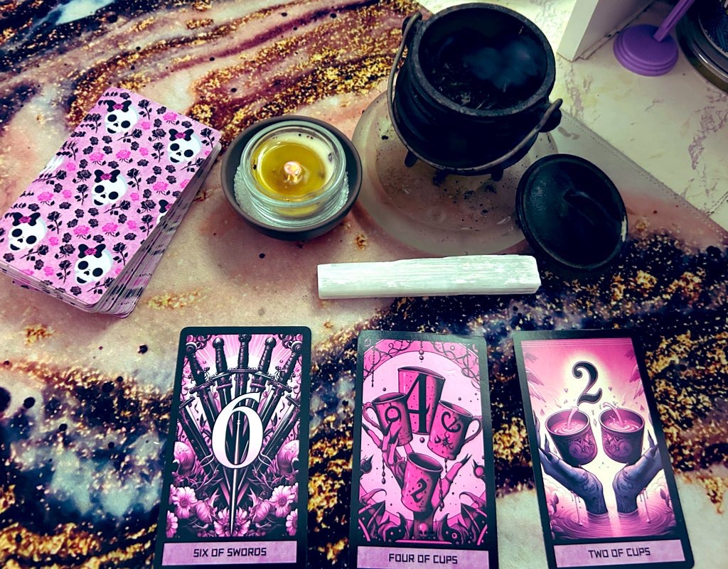 Using my Pink Goth Tarot deck and one of my Abundance tealight candles, my Selenite, and I have a little sage smoldering in my cauldron.
